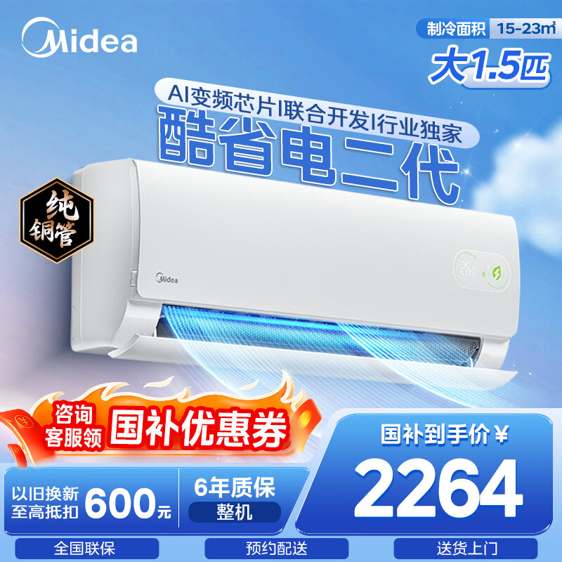 美的(Midea)美的空调酷省电二代1.5匹 新品推荐 新一级能效变频卧室双排蒸发器空调挂机海思芯片【2026款 】 酷省电二代 大1.5匹 制热省电率30% 1月1日首发