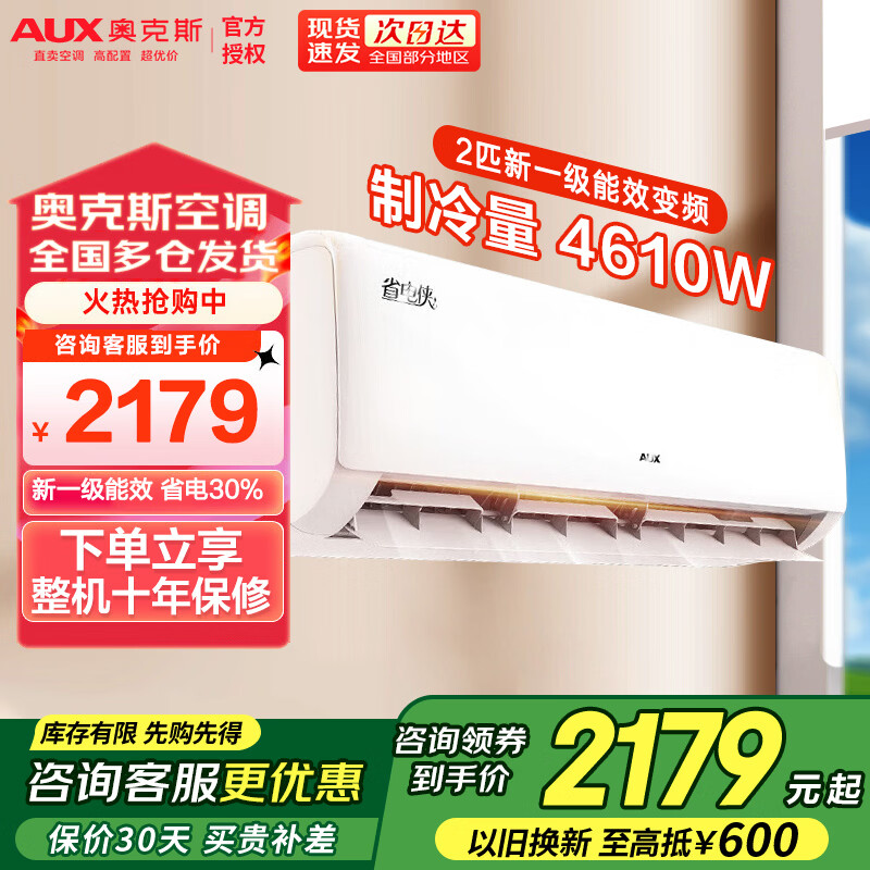 奥克斯空调挂机 大2匹3P新一级/三级能效直流变频冷暖挂壁式空调 家用客厅推荐 以旧换新 制冷量4610W 2匹 一级 变频冷暖(20-30㎡) 滂湃大风量