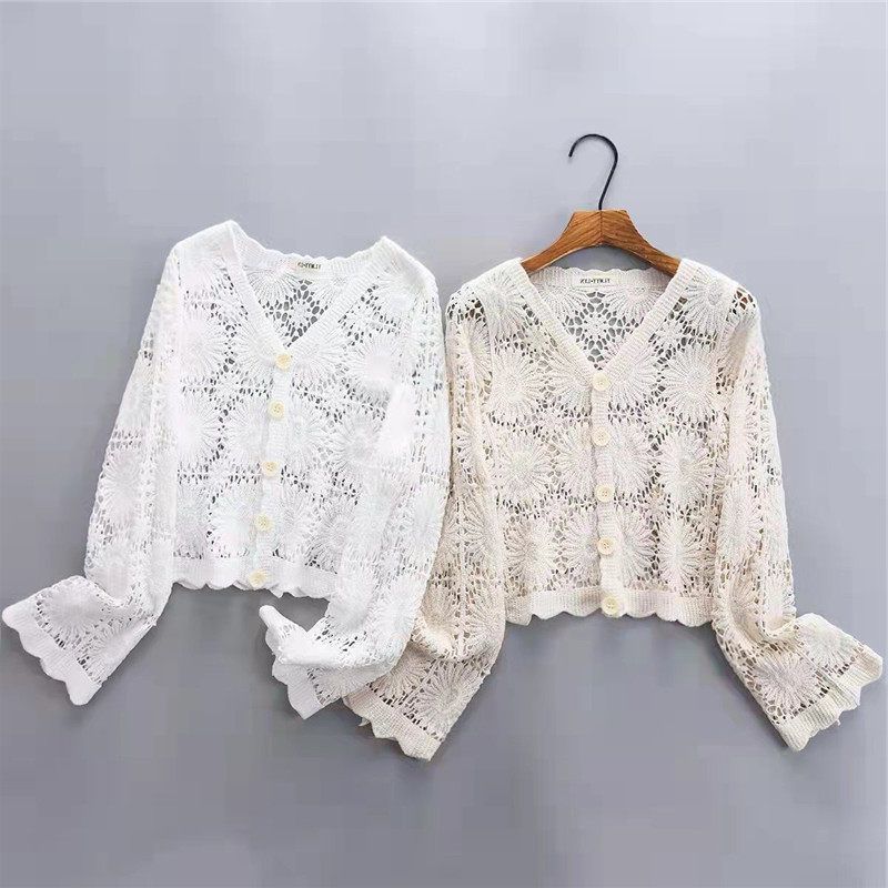 蕾丝女棉质香风镂空空调长袖上衣小夏季V纽扣衫短款领防晒开衫衫