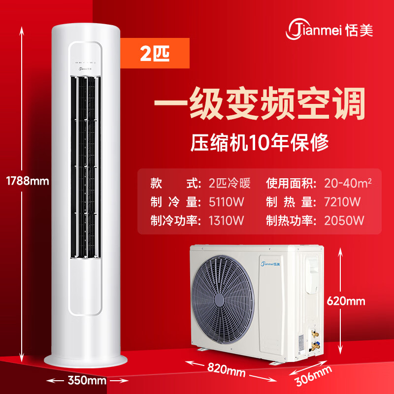 恬美立式空调冷暖变频空调大2匹大3匹一级能效柜机空调节能省电圆柱式柜机客厅空调广角大风量柜机 大2匹一级能效变频冷暖立式柜机【全铜管】 基础安装