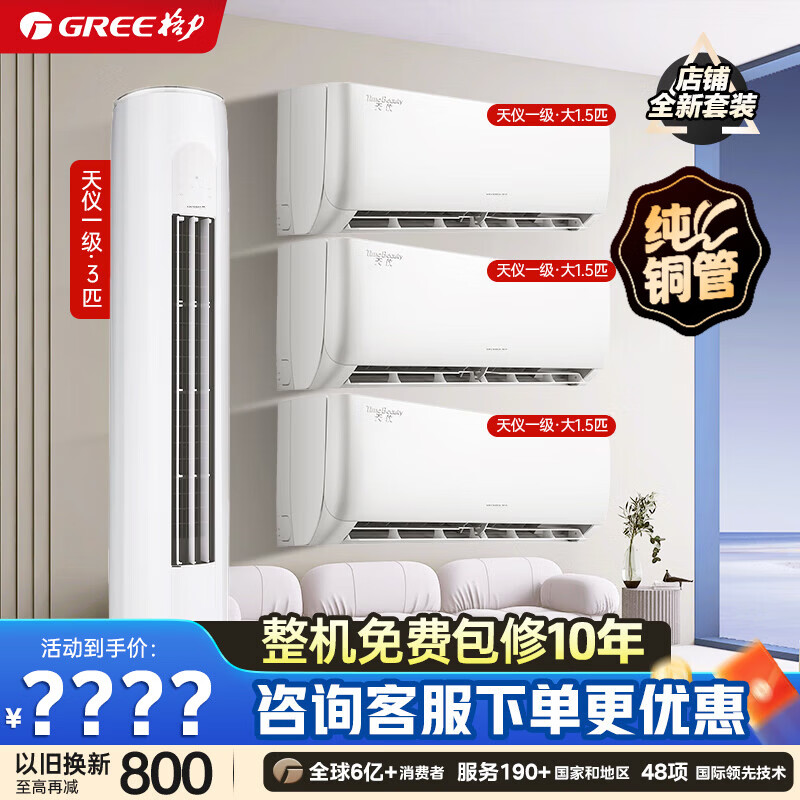 格力(GREE)空调套装 天仪/云锦三代 柜机挂机套购组合 新一级能效 净菌自清洁 变频冷暖节能卧室客厅空调 大三室一厅【天仪1.5匹*3+3匹】