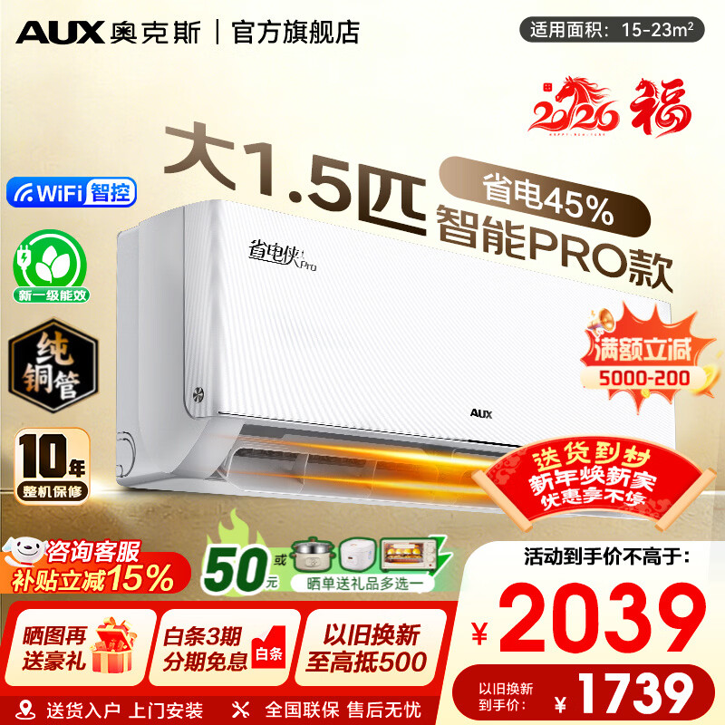 奥克斯空调挂机1.5匹省电侠Pro新品一级能效变频冷暖省电节能除菌自清洁壁挂式以旧换新家电厂家补贴15% 省电侠Pro 大1.5匹 一级能效双排铜管WiFi款