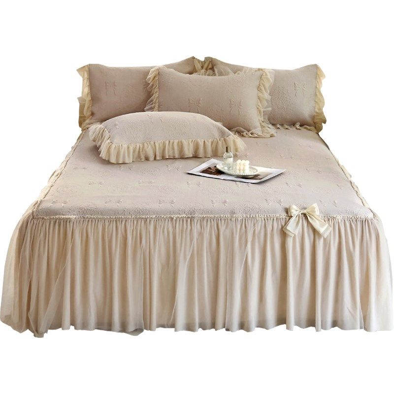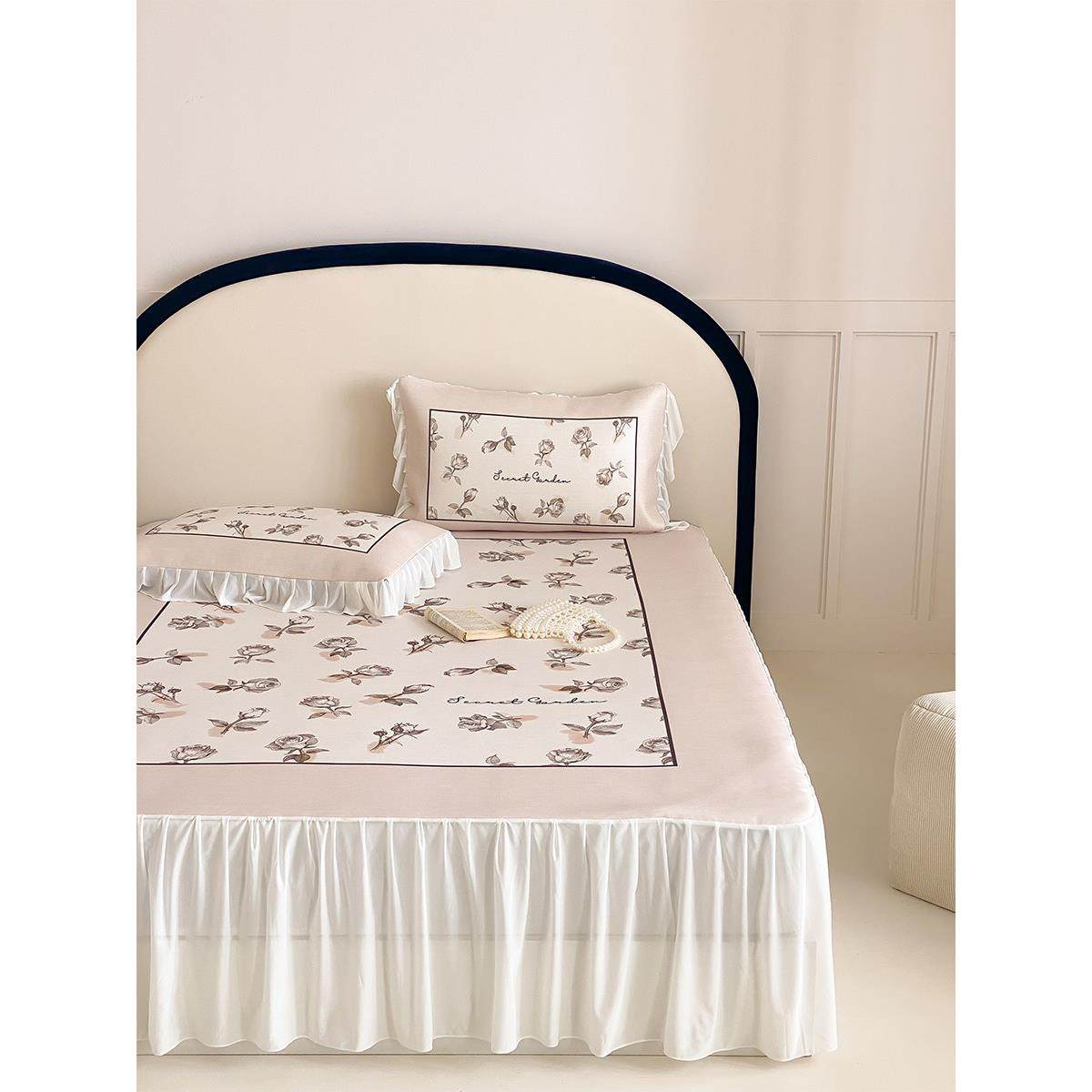 夏季裸睡冰豆豆凉席床裙款三件公主风蕾丝边纯色凉感空调软席子