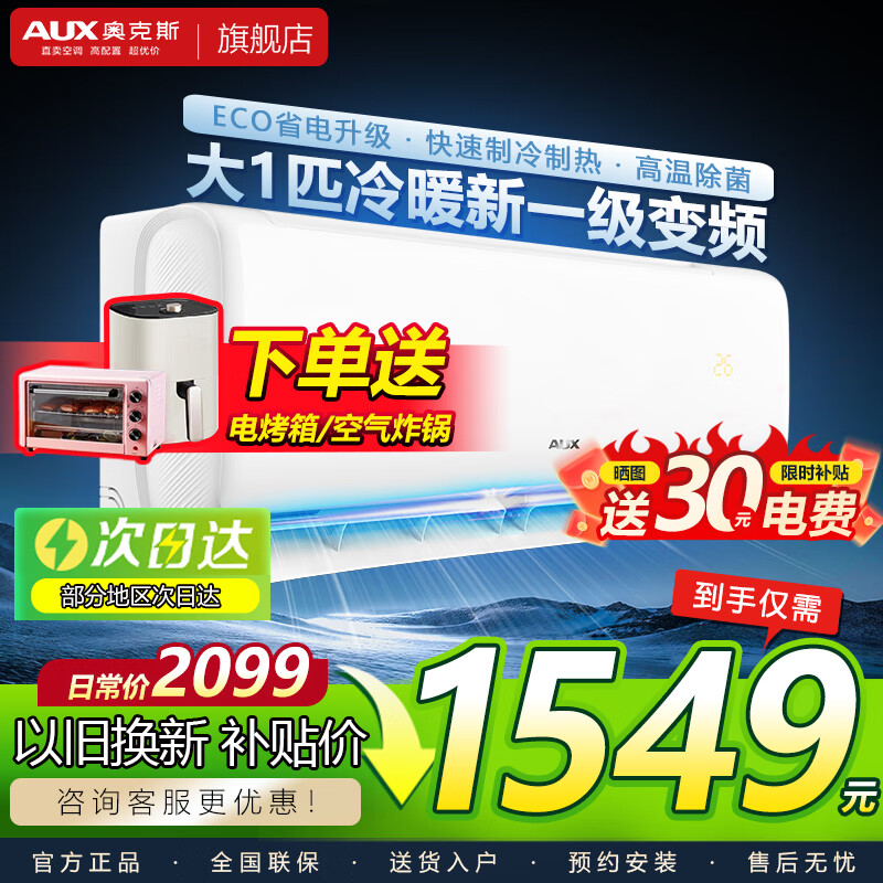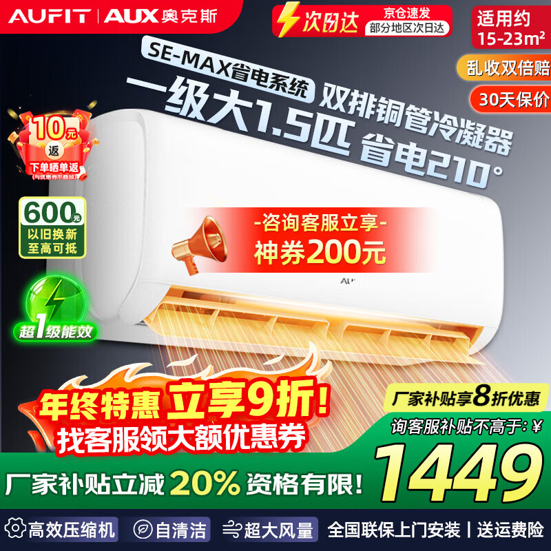 AUFIT空调奥克斯(AUX)出品 家电补贴20% 大1匹/1.5匹/大2匹新一级变频冷暖 智控省电除菌自清洁空调挂机 大1.5匹 一级能效 超值性价比(15-23平)
