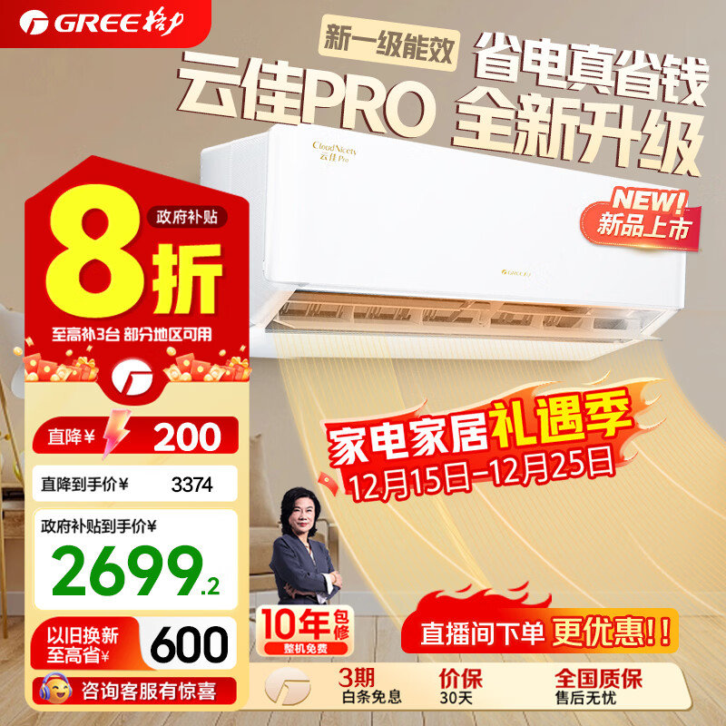 格力(GREE)空调云佳/云炫/云佳pro新一级能效【超级省电】家用节能 变频冷暖壁挂式卧室空调挂机56℃高温自洁 1.5匹 一级能效云佳PRO