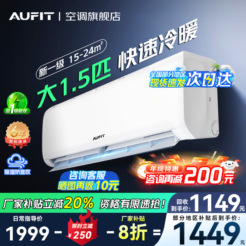 AUFIT空调奥克斯(AUX)出品挂机大1.5匹新一级能效变频冷暖家用卧室壁挂式防直吹除菌自清洁国补20%空调 大1.5匹 一级能效省电防直吹