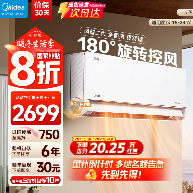 美的(Midea)空调 1.5匹风尊二代 新一代舒适空调 一级能效变频冷暖 壁挂式挂机智能家电云朵系列 国家补贴 1.5匹 一级能效风尊二代 全国联保 配送