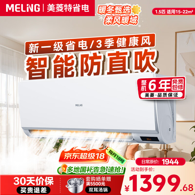 美菱特省电空调 家电国家补贴20% 大1.5匹 新一级能效 以旧换新 变频冷暖卧室空调挂机 节能静音防直吹 特省电 大1.5匹 一级能效舒适风【6年包修】