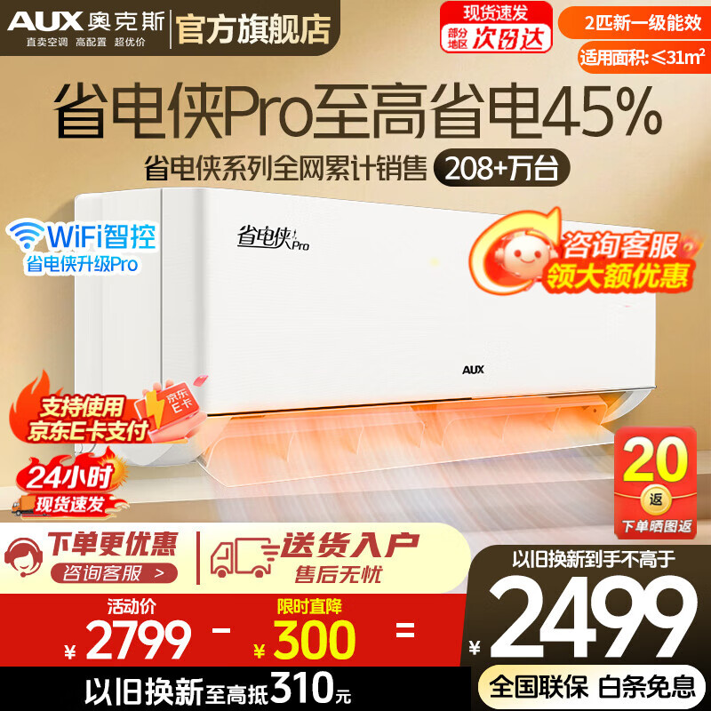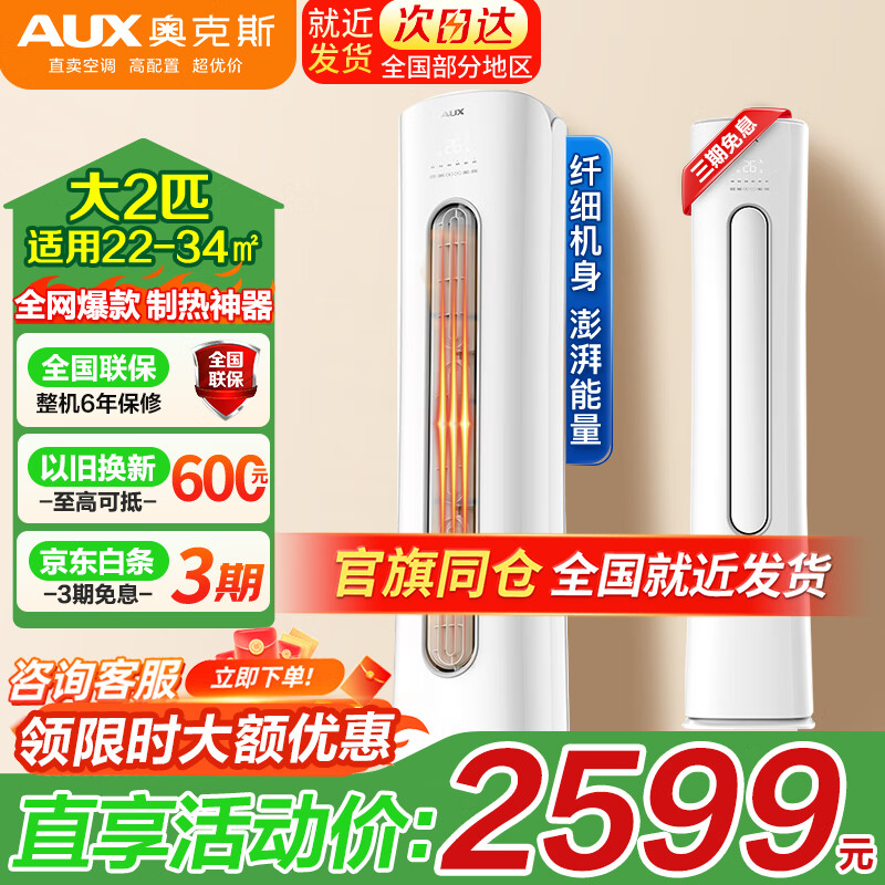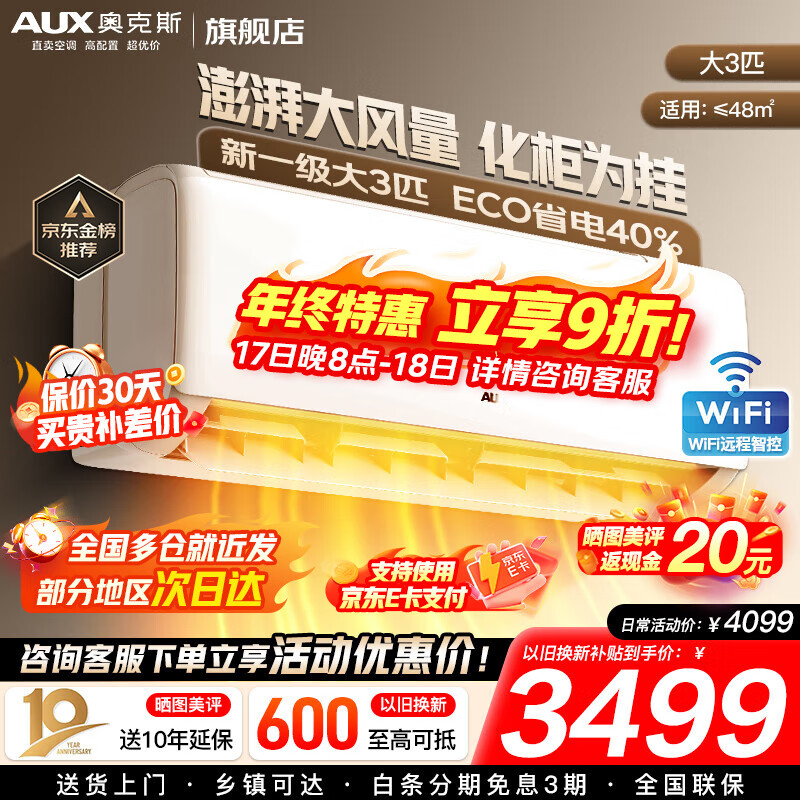 奥克斯(AUX) 空调挂机 2匹/3匹新一级能效 变频冷暖 自动清洁 壁挂式家用节能空调挂机 以旧换新 3匹 一级能效 变频冷暖:32-48㎡