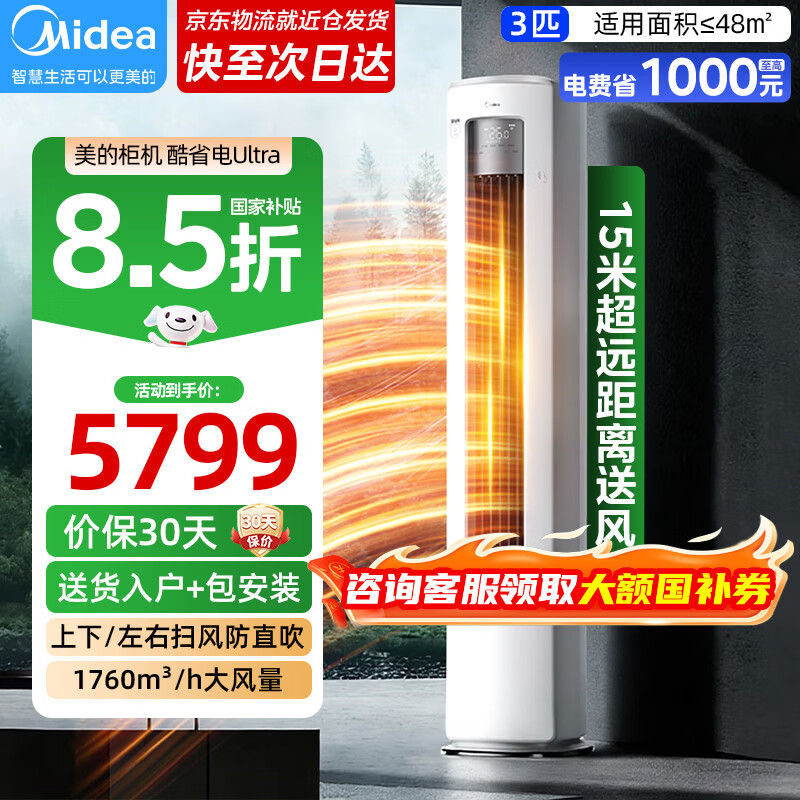 美的(Midea)空调2/3匹柜机大风量供暖制热酷省电Ultra 一级能效变频冷暖AI酷省电技术节能抗寒自清洁立式柜机 酷省电Ultra 大3匹 一级能效 72KS1-1U
