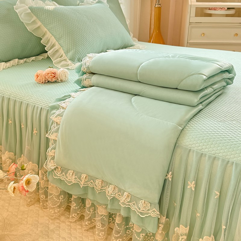 夏季裸睡冰丝凉席蕾丝边床裙款三件套公主风纯色空调席凉感软席子