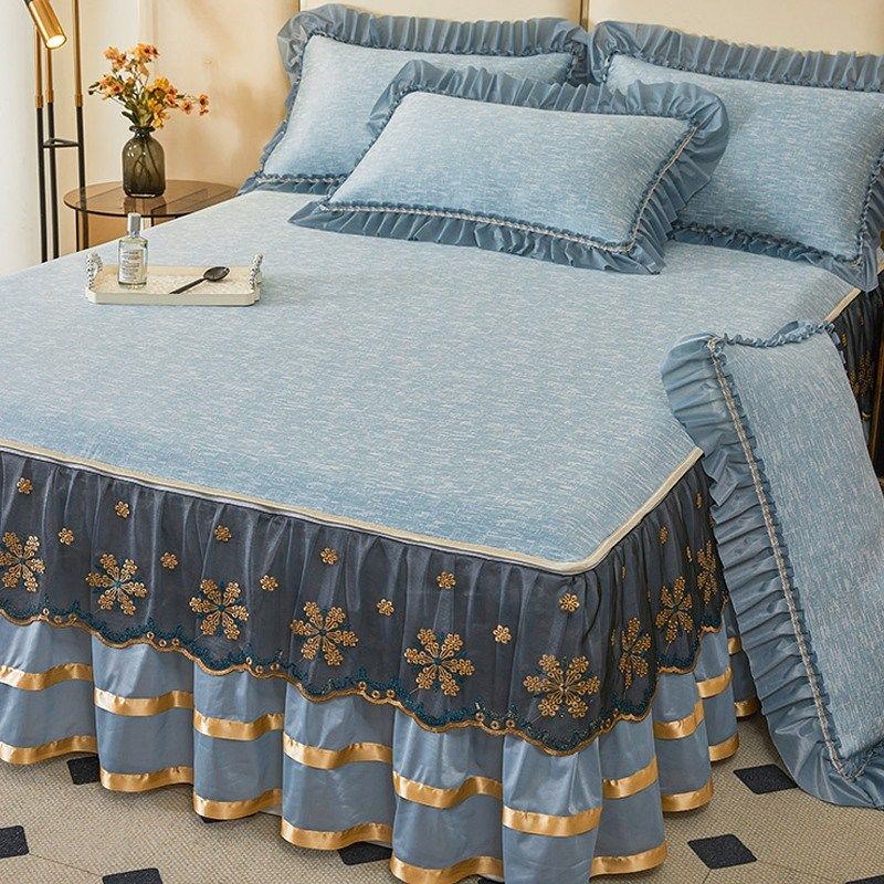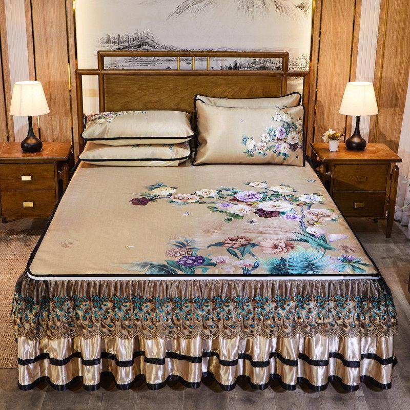 夏季600D冰丝席三件套蕾丝床裙款凉席可脱卸机洗折叠式空调软席子