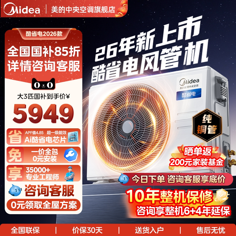 美的中央空调酷省电风管机家用一拖一客餐厅大3匹一级能效风管式