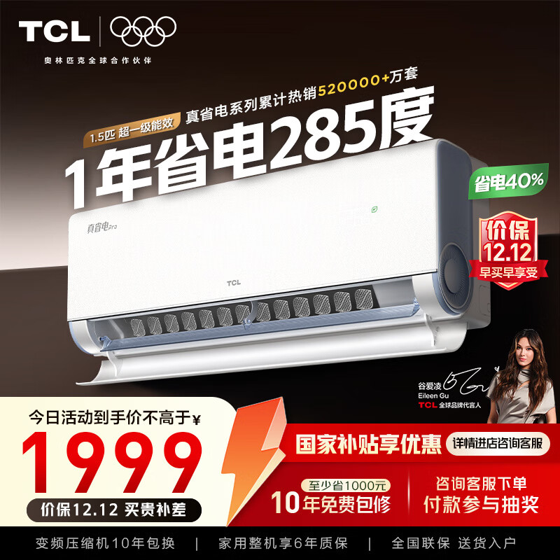 TCL空调1.5/2匹 小蓝翼真省电Pro 空调挂机 超一级能效省电40% 大风量变频冷暖 壁挂式卧室柔风挂机 1.5匹 一级能效 真省电Pro省电40%