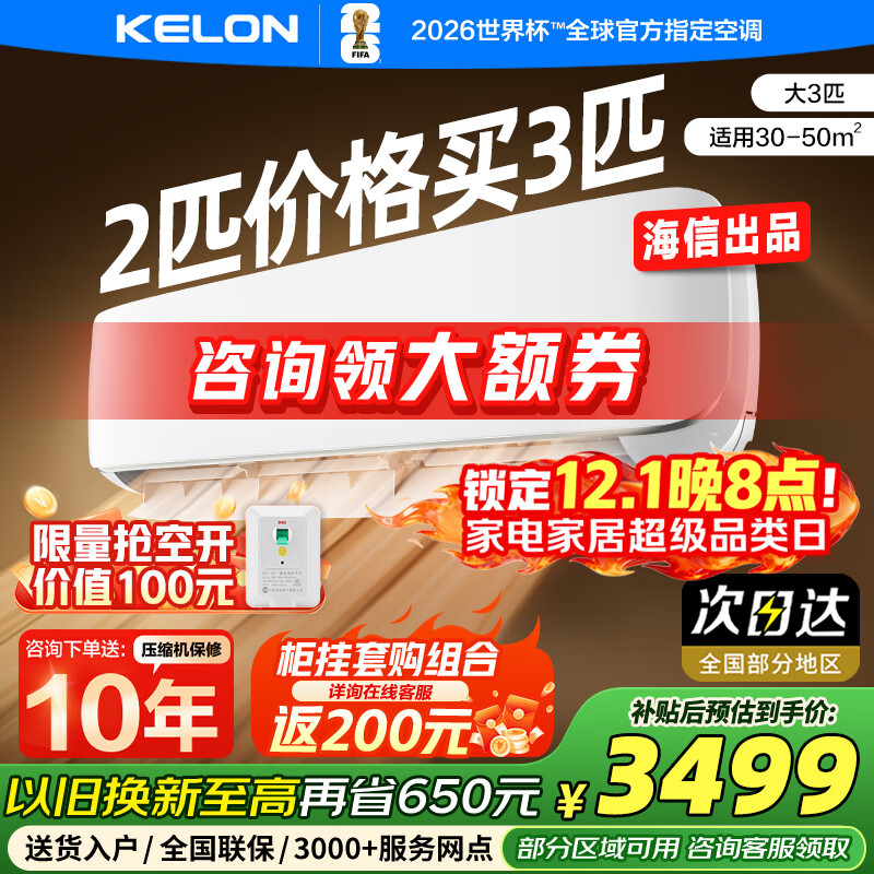 科龙3匹空调挂机 新一级能效变频 国家补贴 客厅省电pro 海信出品比柜机省地 上门安装KFR-72GW/QS1-X1