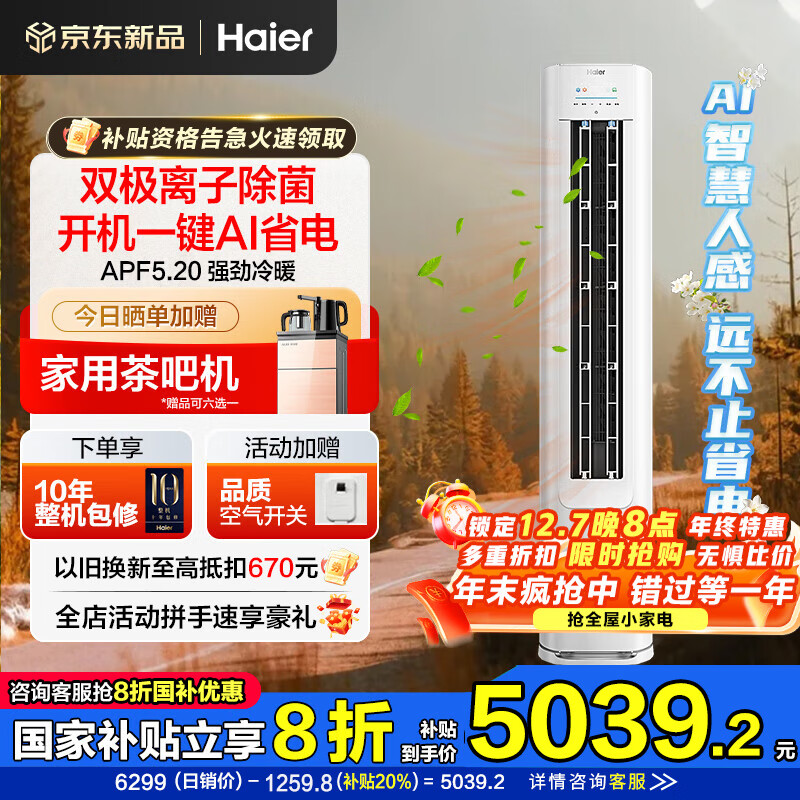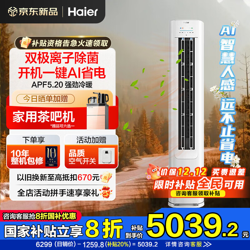 海尔空调净省电Plus 3匹强劲冷暖新一级能效节能变频家用立式柜机独立除湿以旧换新升级大风口离子除菌 3匹 一级能效 净省电神机+离子除菌+省电大魔王