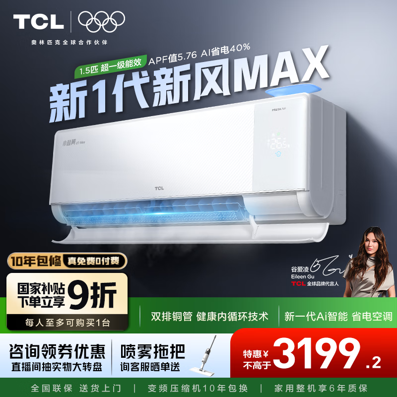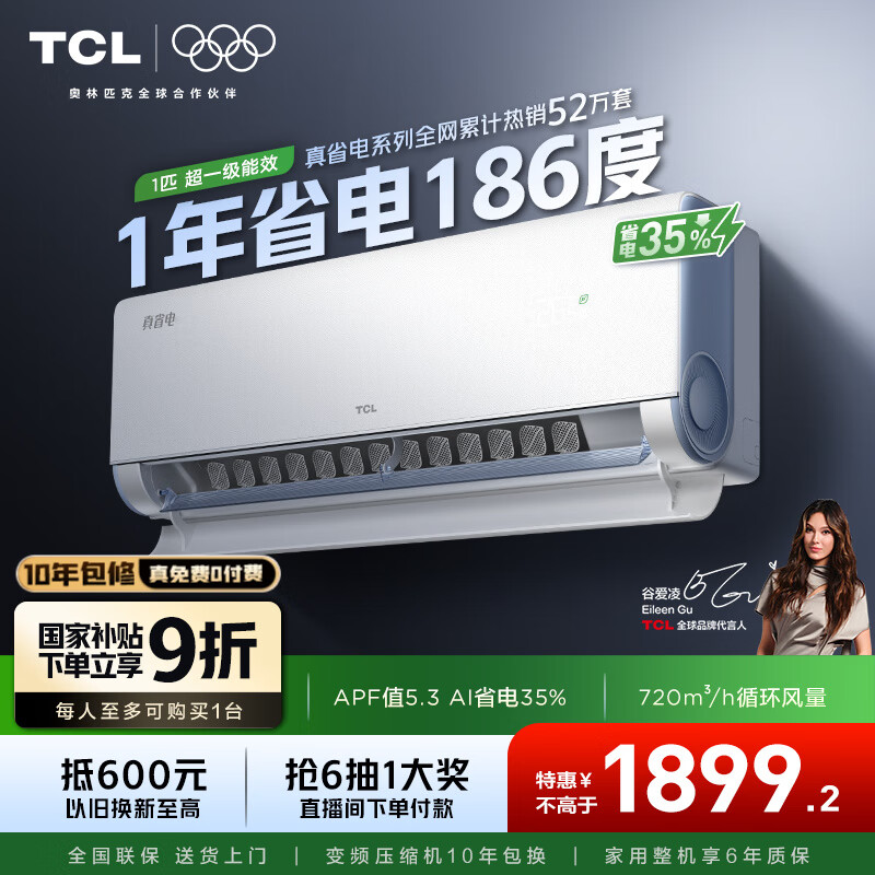 TCL1匹/1.5匹小蓝翼真省电节能空调挂机超一级能效Ai省电35% 壁挂式家用变频冷暖以旧换新国家补贴 1匹 一级能效 真省电系列 挂机