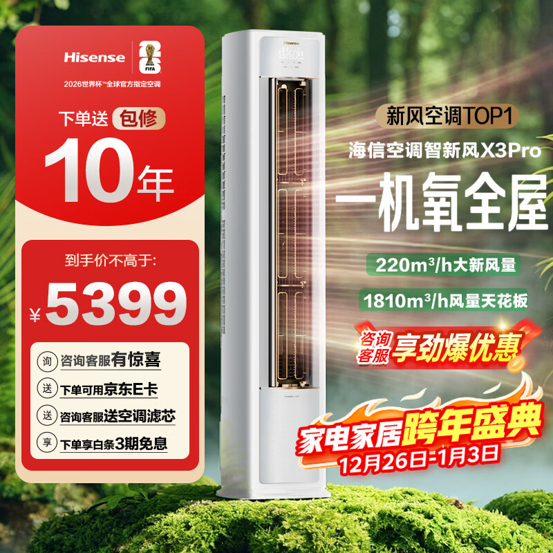 海信(Hisense)智新风X3Pro 大3匹 220m³/h新风量 AI省电 新风5重净化 大客厅柜机新风空调 KFR-72LW/X300Pro-X1 【咨询客服享优惠】