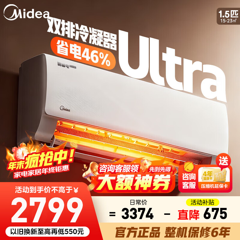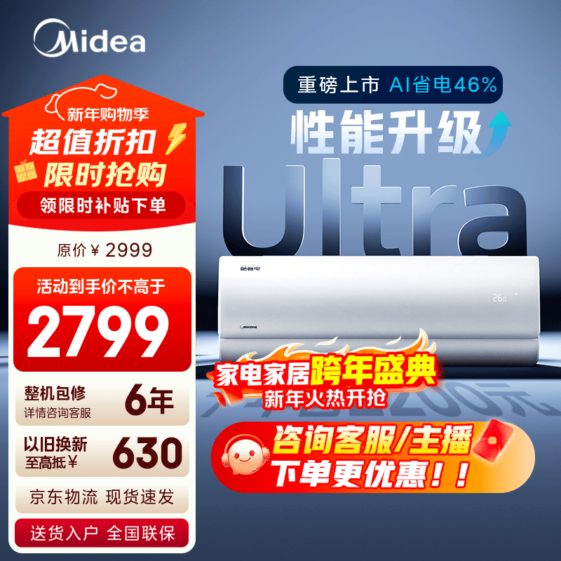 美的空调 爆款推荐 酷省电 新一级能效 变频冷暖 家电国家补贴入口 节能省电家用卧室挂机 以旧换新 酷省电Ultra 大1.5匹 双排外机制热