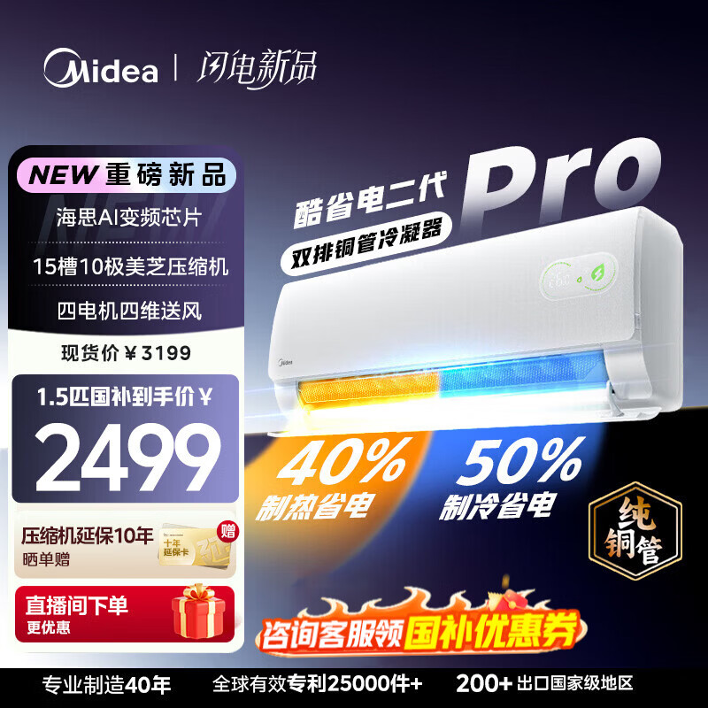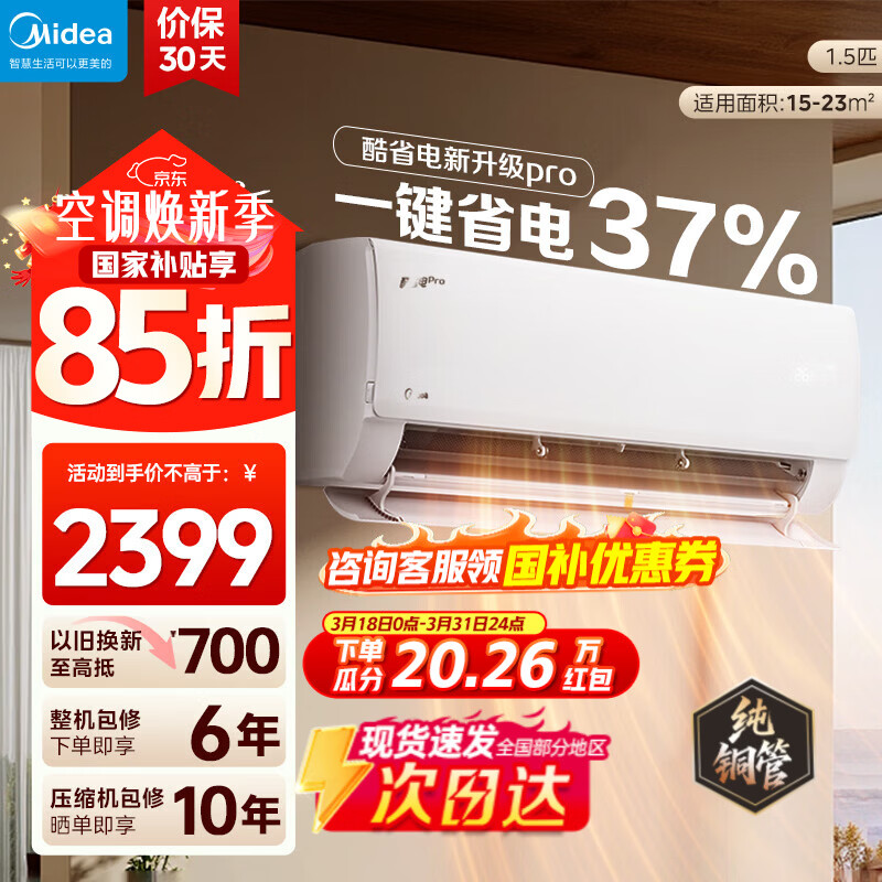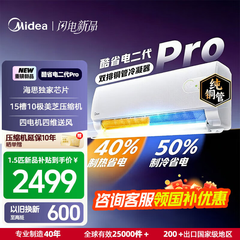美的(Midea)国家补贴15% 酷省电二代PRO大1.5匹 空调挂机 新一级能效 ultra 变频节能省电冷暖家用卧室壁挂式 酷省电二代 26年新款 一级能效 大1.5匹 双排铜管