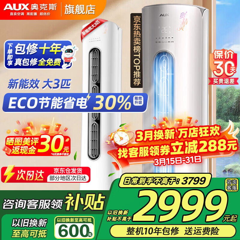奥克斯(AUX)大3匹新一级/三级立柜式空调变频冷暖2匹 家电补贴20% 省电自清洁除菌空调柜机 以旧换新 大3匹 三级能效 【爆款超值性价比】32-48平