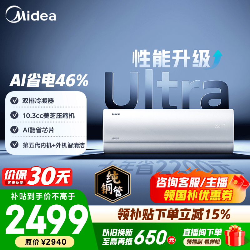 美的(Midea)空调挂机大1.5匹 酷省电二代Pro 店长推荐 双排铜管一级能效变频冷暖家用空调 以旧换新 国家补贴 酷省电Ultra 大1.5匹 一级能效