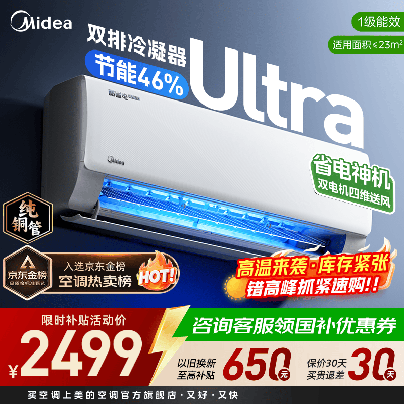 美的(Midea)美的空调1匹/1.5匹挂机 酷省电一代/二代系列变频冷暖新一级能效节能省电 以旧换新 官方旗舰店 酷省电Ultra 大1.5匹 双排省电46%