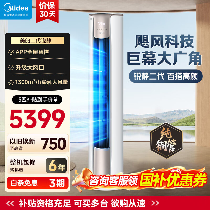 美的空调柜机 2匹/3匹 锐静/锐云 新一级能效 变频冷暖 客厅圆柜立式柜机空调 国家补贴 以旧换新 锐静 3匹