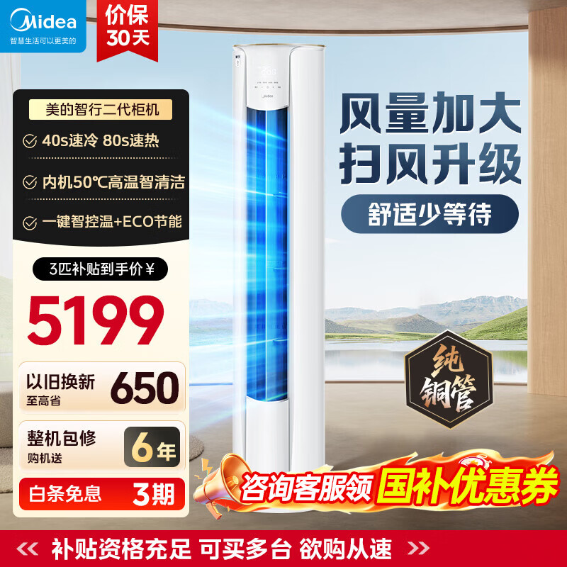 美的(Midea)3匹 空调 新一级能效 变频冷暖家用柜机 智行新款 自清洁智控客厅圆柱立式 meide空调 国家补贴 智行 大3匹 一级能效智行二代升级款