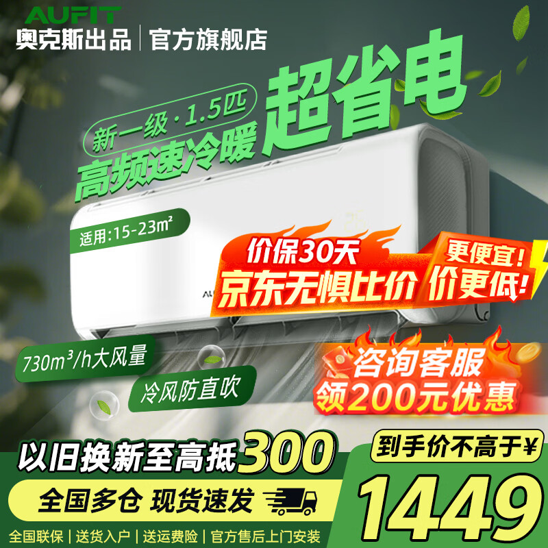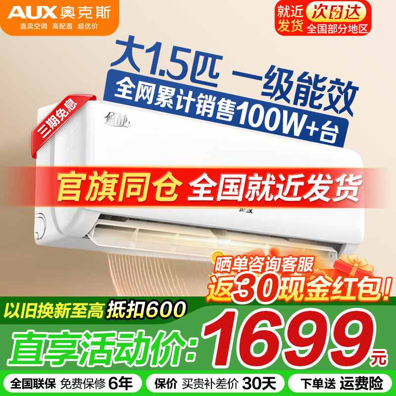 奥克斯(AUX)空调大1.5匹新一级变频冷暖 大1p节能静音自清洁一键舒风卧室壁挂机 以旧换新家电补贴20% 大1.5匹 一级能效【热销神机】15-23㎡