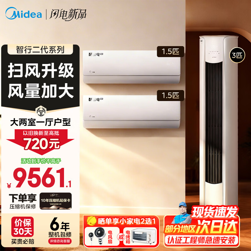 美的(Midea)空调套装 智行二代+酷省电柜挂套购 新一级能效 变频冷暖家用客厅立式柜机卧室挂机空调 以旧换新 【3匹柜机】大两室一厅空调套装【全一级能效】