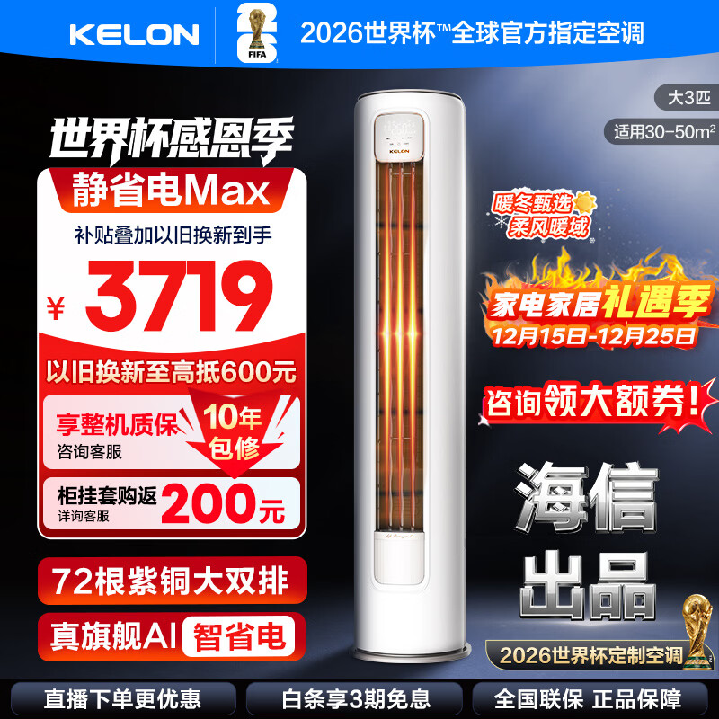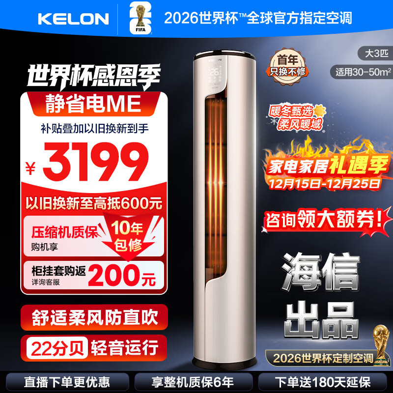 科龙(KELON)空调 海信出品 静省电MAX 询单减200 大3匹柜机 客厅立式新一级变频家用冷暖轻音好眠AI省电 大3匹 一级能效 【咨询享国补价】