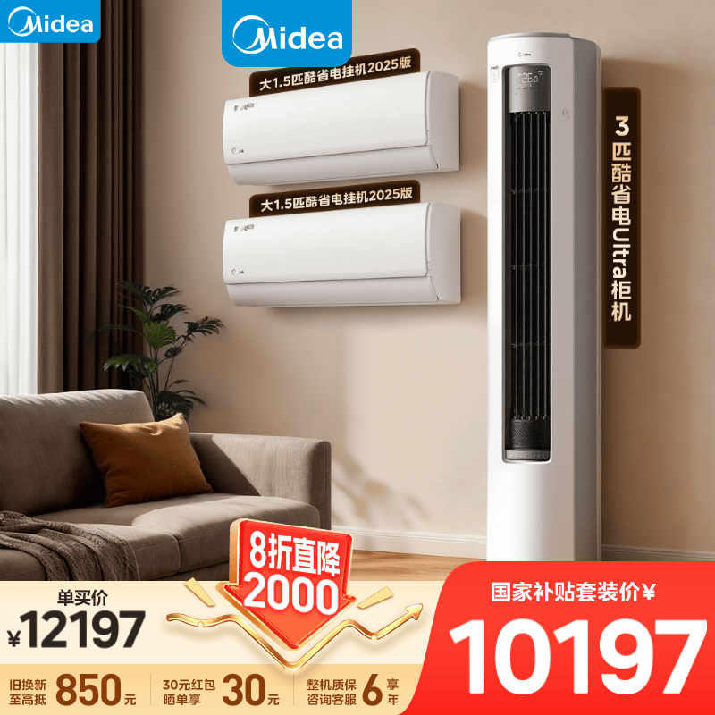 美的(Midea)空调套装 一级能效 变频冷暖节能自清洁家用客厅卧室空调 一套购齐 家电国家补贴柜挂套装三室一厅 酷省电2025版挂机+酷省电U柜机 大三室一厅