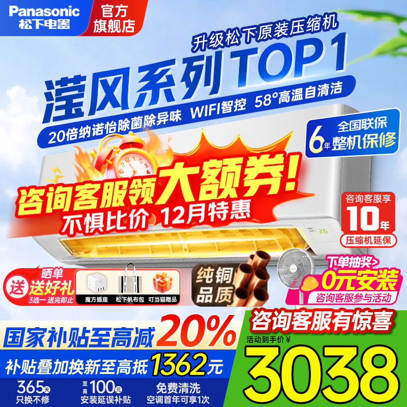 松下(Panasonic)滢风系列1匹/1.5匹空调挂机节能省电直流变频冷暖纳诺怡除菌家用壁挂式原装压缩机以旧换新补贴 滢风 1.5匹 一级能效滢风二代【JM35K410】