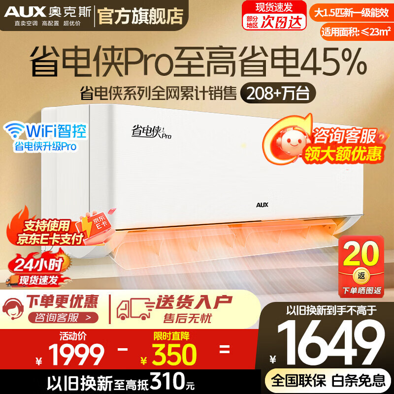 奥克斯(AUX)空调1.5匹 挂机新1级能效独立除湿节能省电一键舒风壁挂式卧室冷暖自清洁以旧换新 省电侠Pro 大1.5匹 新一级能效省电45% 25新款