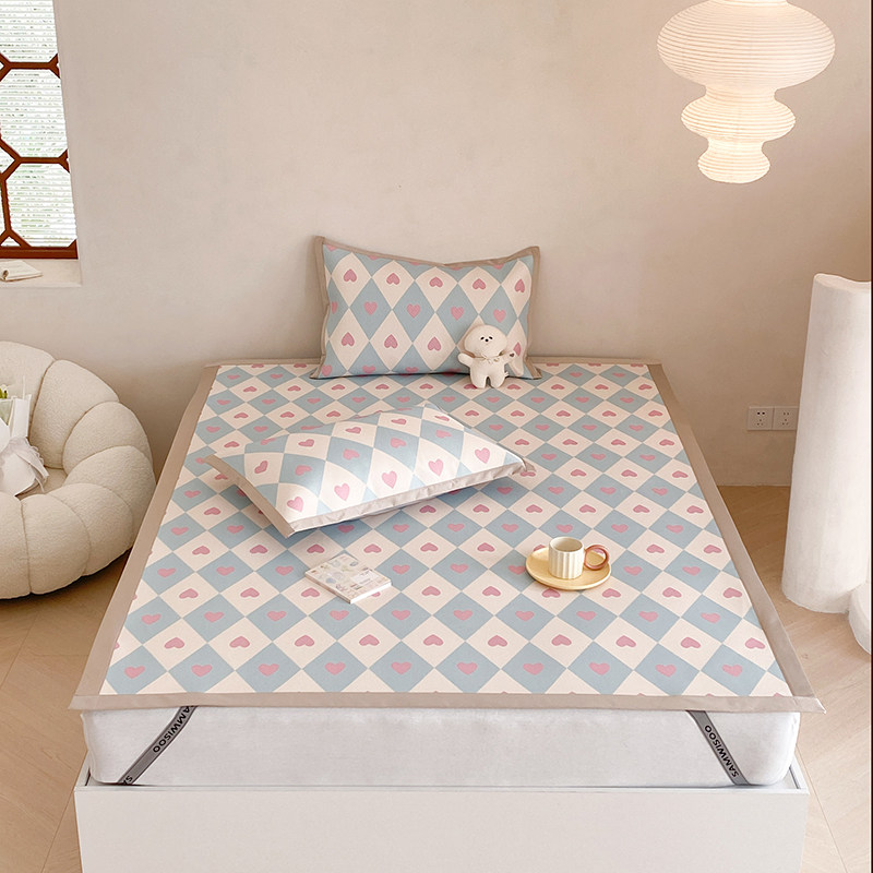 新款少女心夏季冰藤席三件套可水洗爱心印花可折叠1.5米空调软席1
