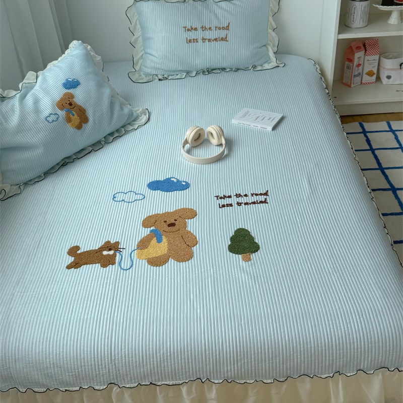夏季冰丝豆豆凉席床裙款三件套可机水洗夏凉垫空调席花边公主床罩