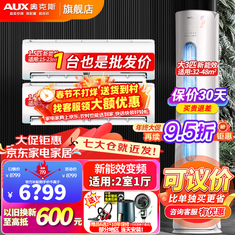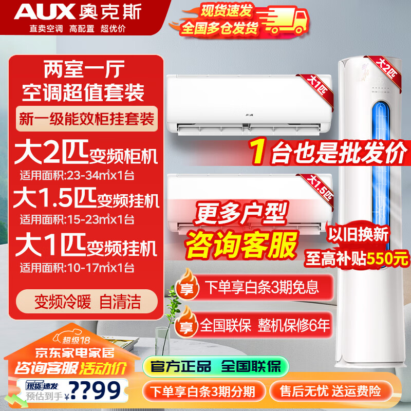 奥克斯(AUX)【超值空调组合套装】新一级能效变频冷暖 节能省电 自清洁立柜式空调+挂壁式空调旗舰款 【两室一厅空调套装】1匹挂+1.5匹挂+2匹柜