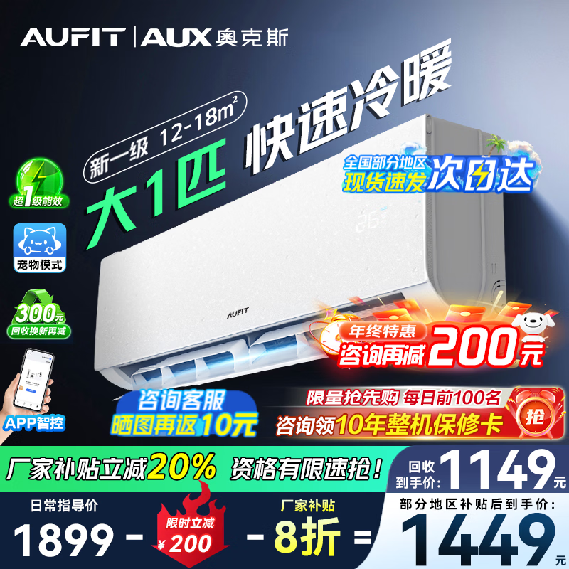 AUFIT空调奥克斯(AUX)出品挂机大1.5匹新一级能效变频冷暖家用卧室壁挂式防直吹除菌自清洁国补20%空调 大1匹 一级能效省电除菌自清洁宠物模式