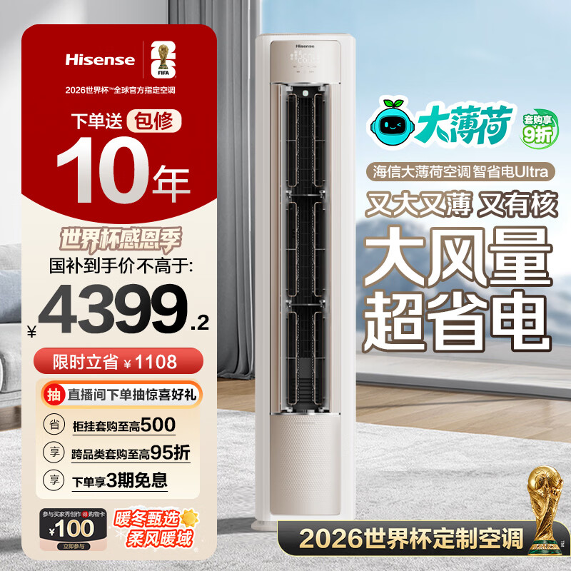 海信(Hisense)大薄荷空调智省电Ultra柜机大3匹 世界杯定制空调AI省电仿真自然风超一级能效国家补贴20%以旧换新 KFR-72LW/E370Pro-X1