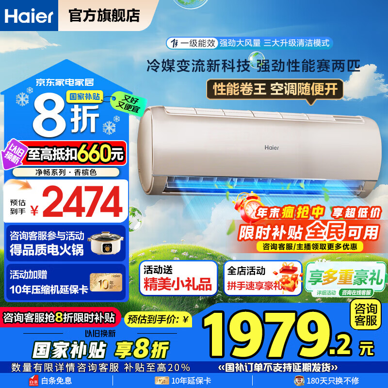 海尔(Haier)新品【小红花】新一级能效 家用变频冷暖空调挂机 独立除湿 卧室省电静音防直吹空调 国家补贴20% 2匹 一级能效两匹双排大空间挂机