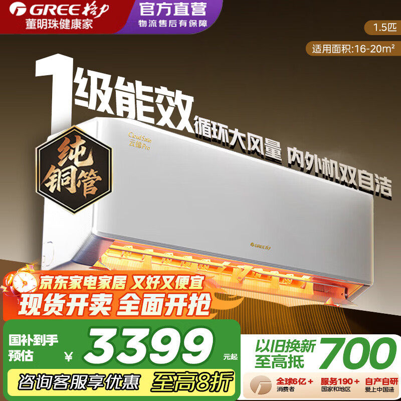 格力(GREE)空调挂机云锦pro 1.5匹新一级能效省电变频冷暖 云锦升级款 自清洁 智能壁式卧室挂机 1.5匹一级能效云锦pro