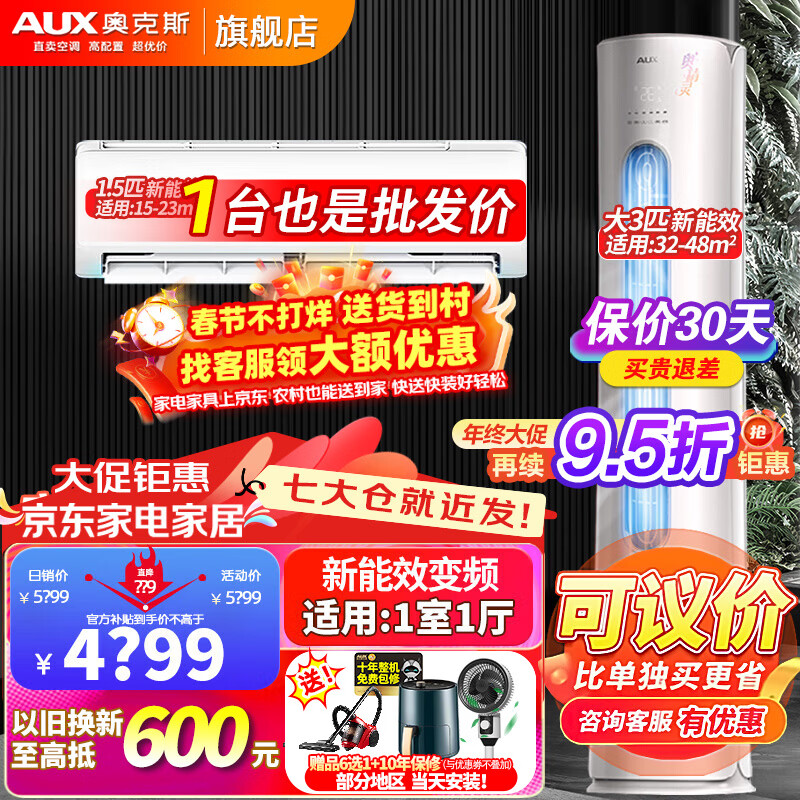 奥克斯(AUX)空调【超值新升级空调套装】大1/1.5/3匹 新能效变频冷暖挂机客厅柜机空调立式套装 (一室一厅)3匹柜+1台1.5匹挂