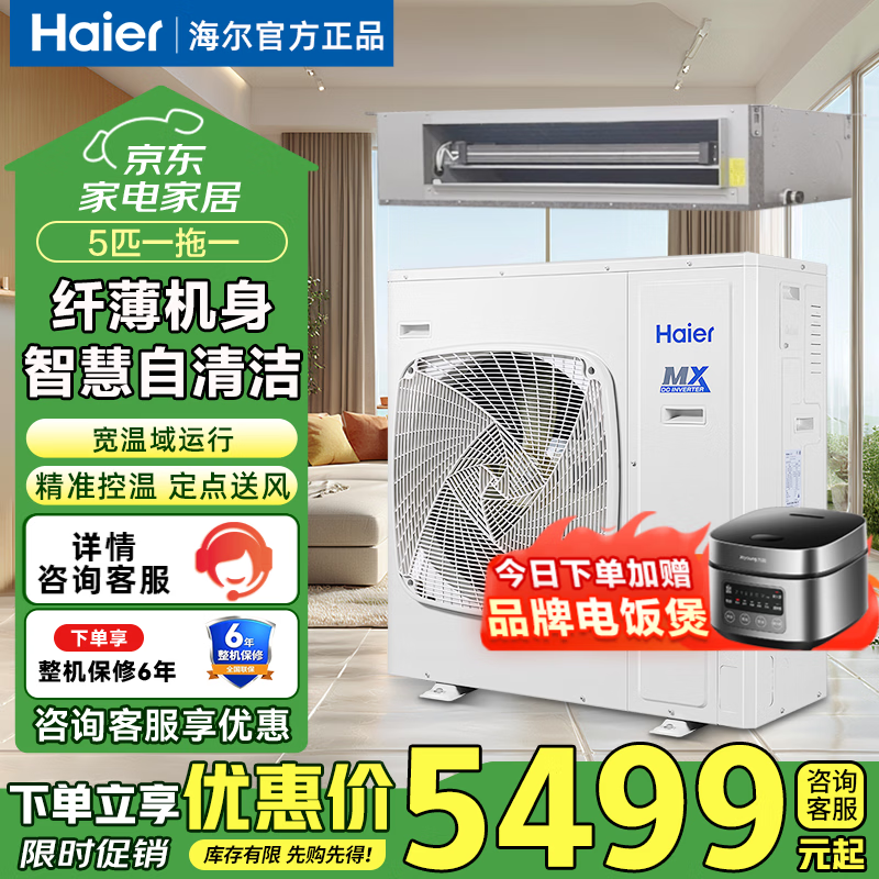 海尔(Haier)中央空调【商用节能爆款】家用风管机一拖一中央空调5匹办公室餐馆厂房商铺商用节能变频中央空调 5匹 二级能效智慧自清洁【不带电辅热】
