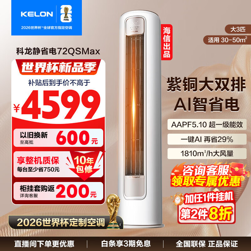 科龙(KELON)海信出品 静省电Max 大3匹柜机 新一级能效 变频速冷热 防直吹 家用客餐厅立柜式空调 以旧换新 大3匹 一级能效 顶配72QSMAX【10年整机包修】