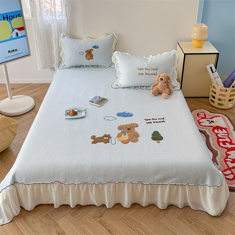 夏季卡通刺绣h凉感席三件套床笠款床裙可机洗夏天空调软席子冰丝