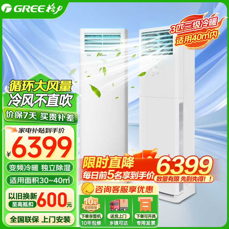 格力(GREE)空调凉之夏3匹 一级/三级节能变频冷暖两用 除尘三合一循环大风量客厅立柜式家用空调 以旧换新 3匹 三级能效适用30-40㎡