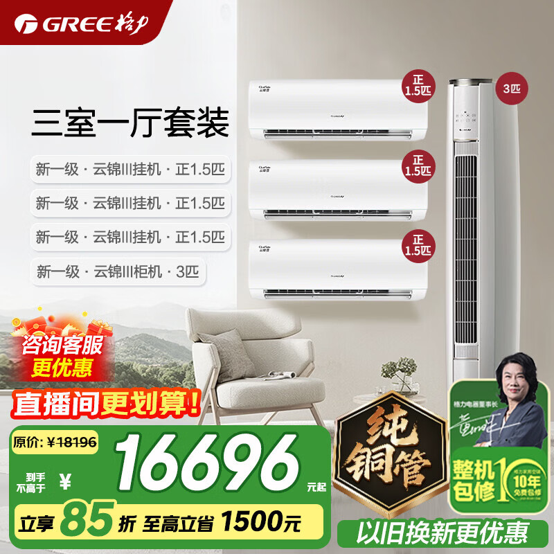 格力空调套装 云锦三代 新一级能效 变频冷暖 自清洁 立式柜组合空调套装 京东官方正品 家电国家补贴 【三室一厅】云锦三代1.5匹*3+3匹*1