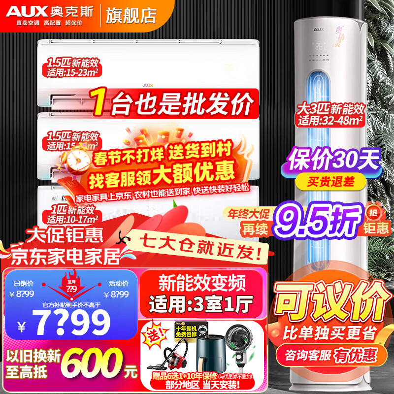 奥克斯(AUX)空调【超值新升级空调套装】1匹/1.5匹/3匹 新能效变频冷暖挂机客厅柜机空调立式套装 (三室一厅)3匹柜+2台1.5匹挂+1台1匹挂
