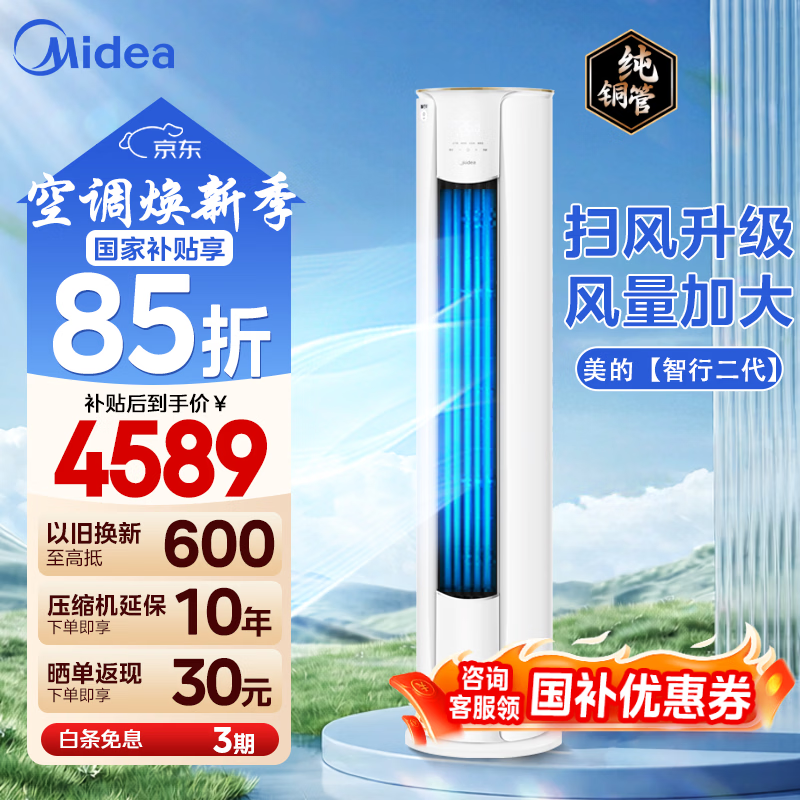 美的(Midea)空调立式智行3匹柜机 新一级能效变频冷暖 圆柱客厅空调立柜式 大风口柜机落地式以旧换新 大3匹 一级能效